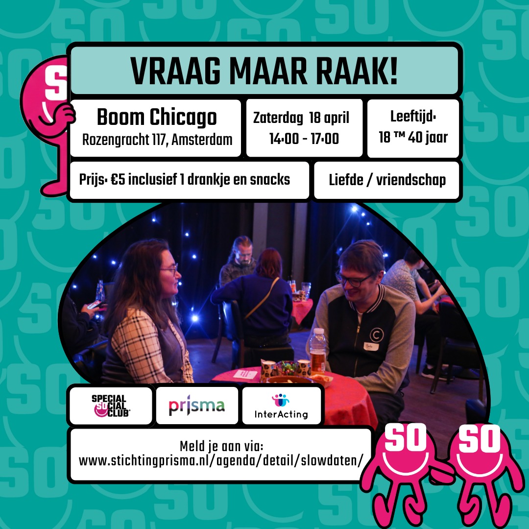 Zaterdag 18 april van 14:00 tot 17:00 is het weer zo ver: het VRAAG MAAR RAAK Dating Event met als thema daten en relaties!
